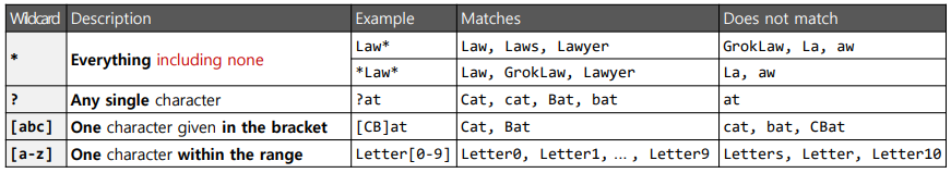 - Wildcards와 같은 특정 패턴에 매칭되는 파일이나 디렉토리들을 찾아서 반환한다.